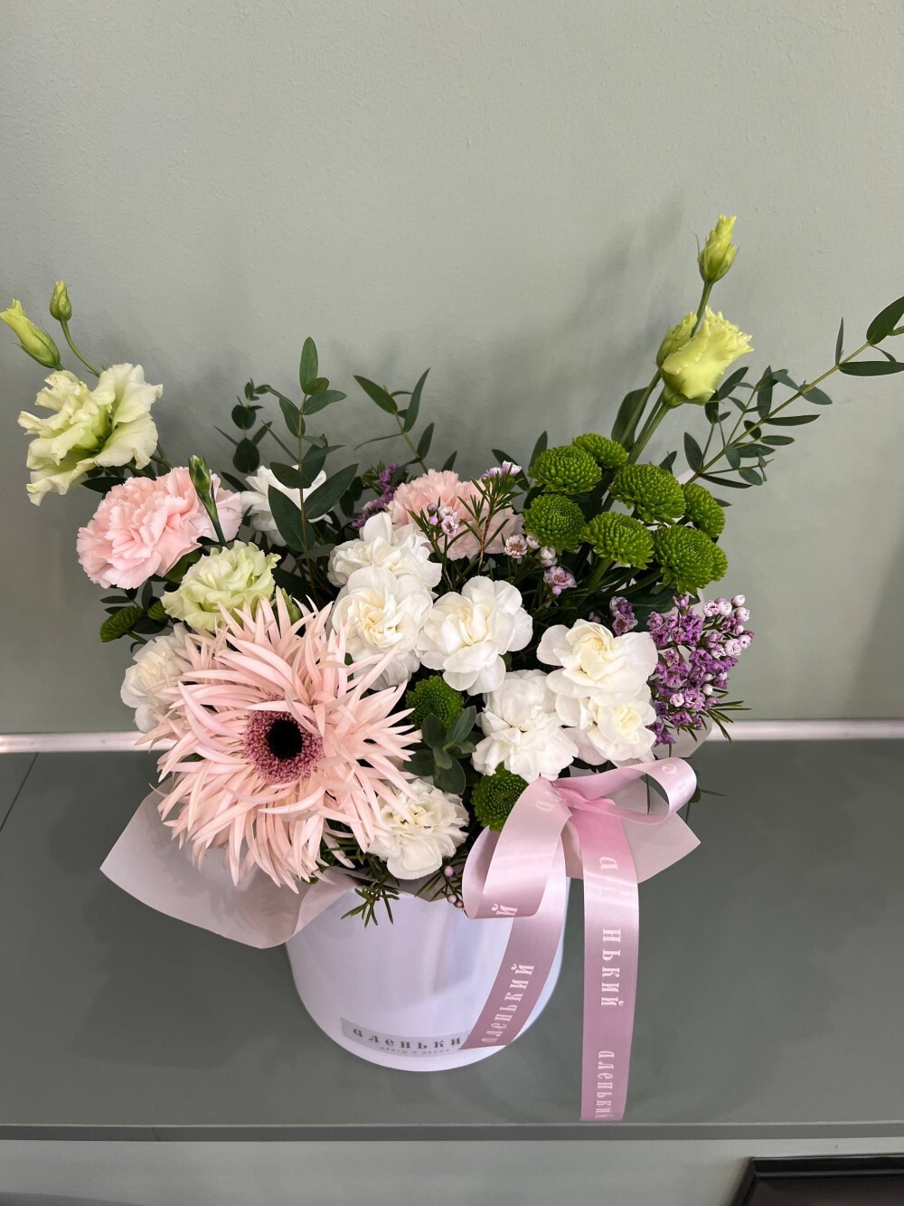 Гербера, Эустома, Диантус, Эвкалипт, Хризантема сантини, Хамелациум