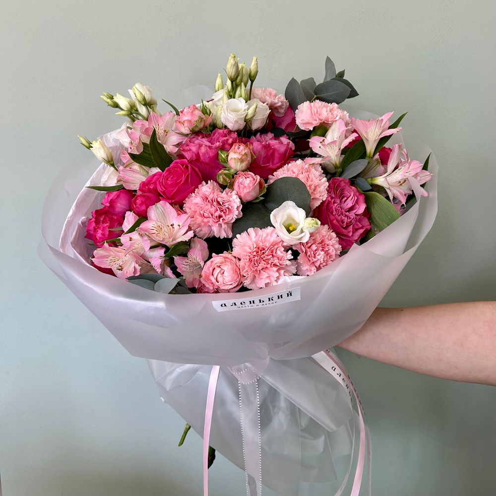 Сборный букет из кустовых роз, альстромерий и пионовидных роз с диантусами